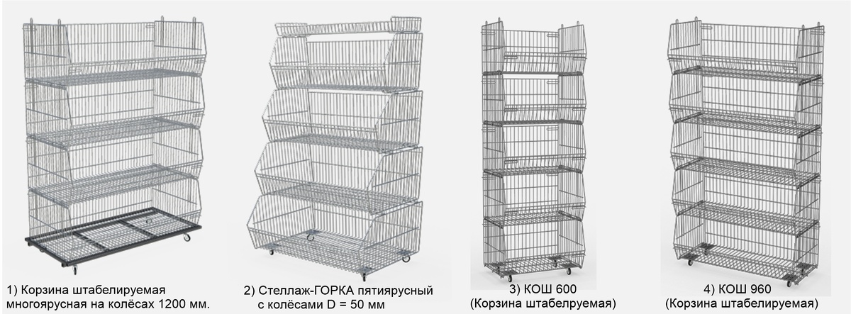 Многоярусные сетчатые штабелируемые корзины получили широкое распространение в торговле. С развитием сетевого ритейла и больших площадей магазинов и супермаркетов, появилась необходимость в легких мобильных (на колесах) вместительных многоярусных стеллажах КОШах. В настоящее время ООО "Юнитрейд" производит 4 вида сетчатых штабелируемых корзин: 1) Корзина штабелируемая многоярусная на колёсах с металлическим каркасом в основании шириной 1200х600мм. Сетчатый стеллаж комплектуется 4 корзинами одинакового объема. Особенностью данного стеллажа является прочное основание из профильной трубы 25х25 мм, на колесных опорах диаметром 50 мм и высотой до 4х ярусов . Нижнее основание из трубы на колесах, съемное, не крепится к основанию -на зацепах. Габариты одной корзины составляют 1200х600х400 мм. Высота стеллажа сотсавляет 1650мм. Корзины взаимозаменяемы и легко крепятся к основанию. Данный стеллаж можно доукомплектовать полочными разделителями. 2) Корзина штабелируемая "Горка"- компл