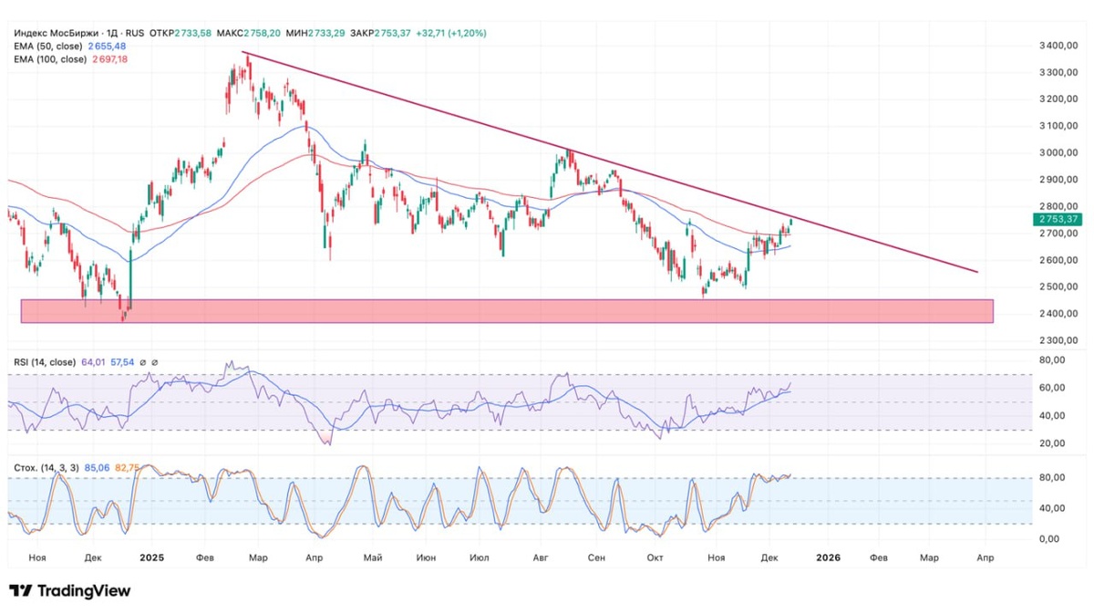 На дневном графике индекс остаётся выше EMA 50 и EMA 100 и сохраняет локальную восходящую динамику. 📉 Но среднесрочный тренд остаётся нисходящим: цена вплотную подошла к трендовой линии сопротивления, которая удерживает рынок с весны 2025 года. Объёмы торгов при этом ниже средних, что говорит об отсутствии широкого покупательского участия в текущем росте. ⚖️ RSI стабилизировался в диапазоне 60–65, не переходя в область сильного тренда и подтверждает замедление импульса. 👉🏻 Стохастик находится в зоне перекупленности и пытается развернуться вниз, повышая вероятность локального отката. 🕯 На свечном графике заметно снижение волатильности и нет уверенных попыток пробоя сопротивления. Технически рынок находится в ключевой зоне: для слома среднесрочного нисходящего тренда нужен пробой и закрепление на дневном графике выше трендовой линии. В таком случае ближайшая цель роста — 2900–3000 пунктов. При ухудшении новостного фона высок риск отката в район 2500 пунктов. 📌 Подробный обзор