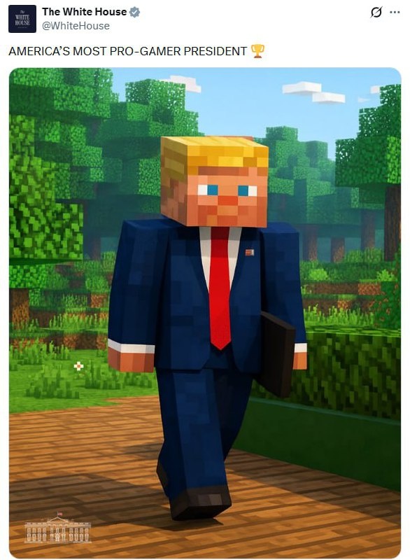 Официальный аккаунт Белого Дома провозгласил Трампа «лучшим другом геймеров» и изобразил президента США в качестве персонажа популярной детской игры Minecraft. Очередная бесполезная регалия американского президента? 👍«БайБайден» в МАХ