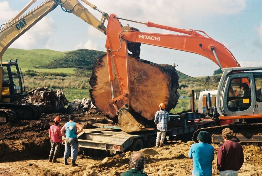 Добыча стволов болотных Каури возрастом 50 тысяч лет в Новой Зеландии. Эти деревья не сгнили и не окаменели