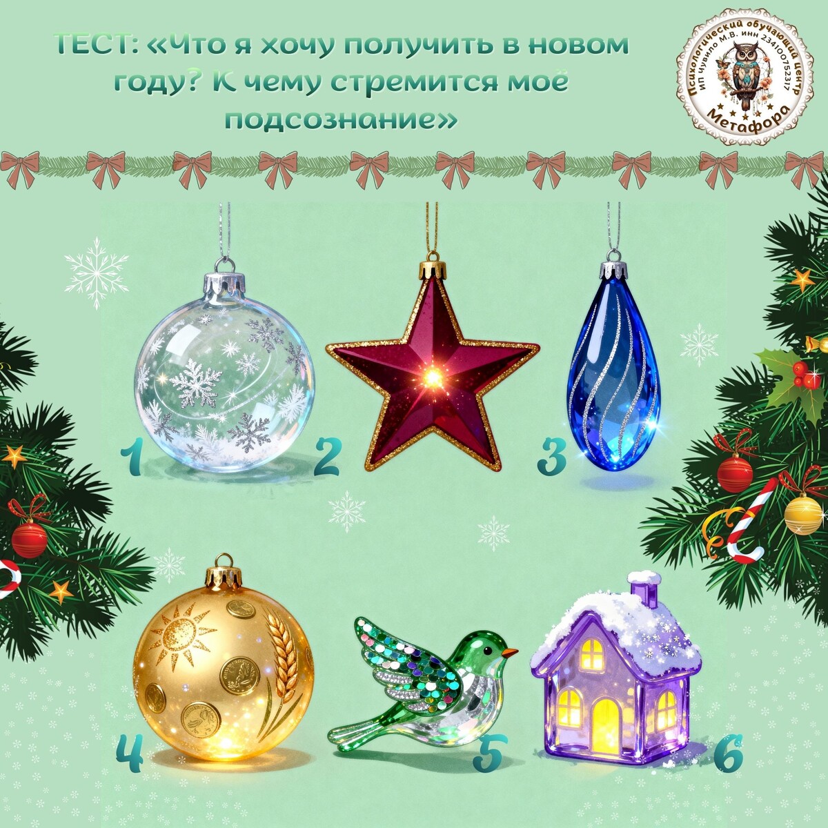 Что я хочу получить в новом году? Новый год всегда приносит с собой особую магию. Это момент, когда даже самые тихие желания становятся чуть громче, а внутренние интуитивные ответы — яснее. Иногда мы думаем, что движемся к одним целям… А подсознание тихо подталкивает к совсем другим — более настоящим, важным, созвучным душе.❄ Сегодня я приглашаю вас в небольшой новогодний тест. Простой, но удивительно точный. Перед вами — шесть ёлочных игрушек.🎄 У каждой свой характер, энергия и послание. Посмотрите на них так, словно выбираете украшение на свою личную волшебную ёлку… и отметьте ту, которая откликается первой. Не думайте. Не анализируйте. Просто доверьтесь ощущению — подсознание всегда знает верный путь.✨ А потом прочитайте, что выбор говорит о том, чего ваша внутренняя часть хочет получить в наступающем году. Готовы узнать своё новогоднее пос