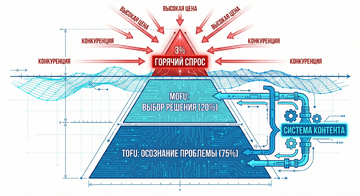 Маркетинг большинства B2B-компаний напоминает гладиаторскую арену. Вы и ваши конкуренты сбиваетесь в кучу, пытаясь отвоевать внимание одних и тех же «горячих» клиентов. Тех самых, кто уже ввел в поиске «Купить [Ваш продукт] цена». Проблема в том, что по статистике (исследования Chet Holmes и др.) таких клиентов в любой момент времени — всего 3-5%. Это «Кровавый океан». Здесь самая высокая цена клика, самая жесткая конкуренция и самая низкая маржинальность. Вы платите аукционную цену за внимание, которое исчезнет, как только закончится бюджет. Я архитектор трафик-систем, и я не верю в битвы на истощение. Я верю в инженерию. Пока вы бьетесь за верхушку айсберга, под водой находится 95% рынка. Это люди, у которых уже есть проблема, но они еще не знают вашего решения. Именно здесь работает стратегия TOFU/MOFU. Это не про «ведение блога». Это про построение промышленного конвейера по выращиванию клиентов. Давайте разберем механику. Если мы перестаем смотреть на контент как на творчество и