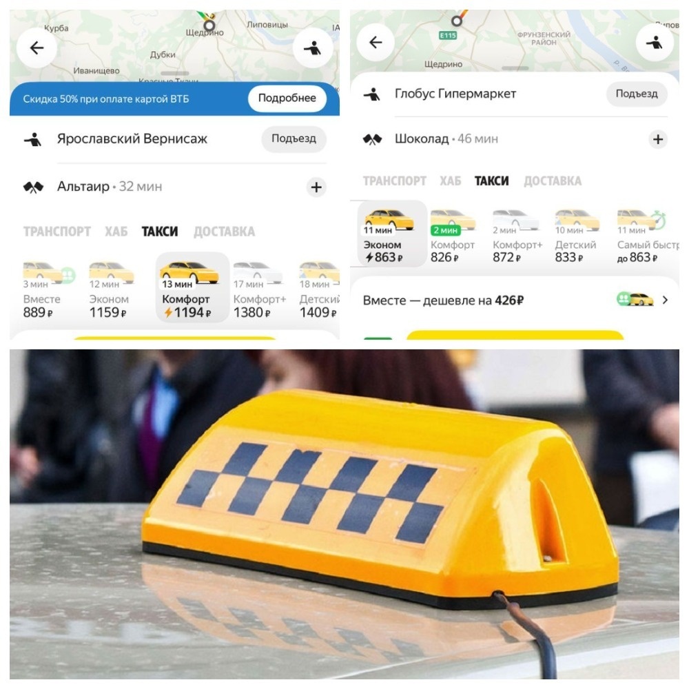 При этом пробки в городе постепенно рассасываются. Напомним, заторы в Ярославле образовались с утра — из-за введения ограничений на проезд по Московскому проспекту и части трассы М-8 на фоне объявления беспилотной опасности. В моменте пробки достигали 9 баллов из 10 возможных. Сейчас сервис Яндекс.Карт оценивает проблемы на дорогах Ярославля в 6 баллов. Впрочем, даже так ценник на услуги такси остаётся высоким, ведь далеко не все уже успели разъехаться. Так, чтобы добраться от ТЦ «Шоколад» на самом выезде из Ярославля до ТЦ «Альтаир», который расположен уже на выезде из Брагино, на самом дешевом тарифе это обойдётся в 934 рубля. Поездка от «Альтаира» до «Глобуса», который располагается на границе Заволжского района Ярославля, будет подешевле — 746 рублей. А вот, например, проезд от железнодорожного вокзала «Ярославль-Главный» до всё того же «Альтаира» обойдётся в совсем скромный 341 рубль. Что касается вояжа от «Шоколада» до «Глобуса», то тут ценник опять не гуманный — 863 рубля. Если