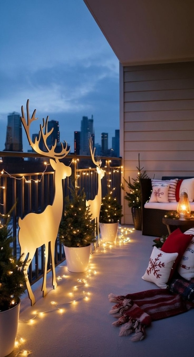 - Добавьте индивидуальности. Это может быть красивая табличка с надписью, стилизованный олень из фанеры или набор деревянных звезд. Такие детали рассказывают вашу историю. На небольшом балконе используйте вертикаль. Подвесные кашпо с композициями из веток, гирлянды, свисающие сверху. Складная мебель с праздничным пледом может служить и украшением.