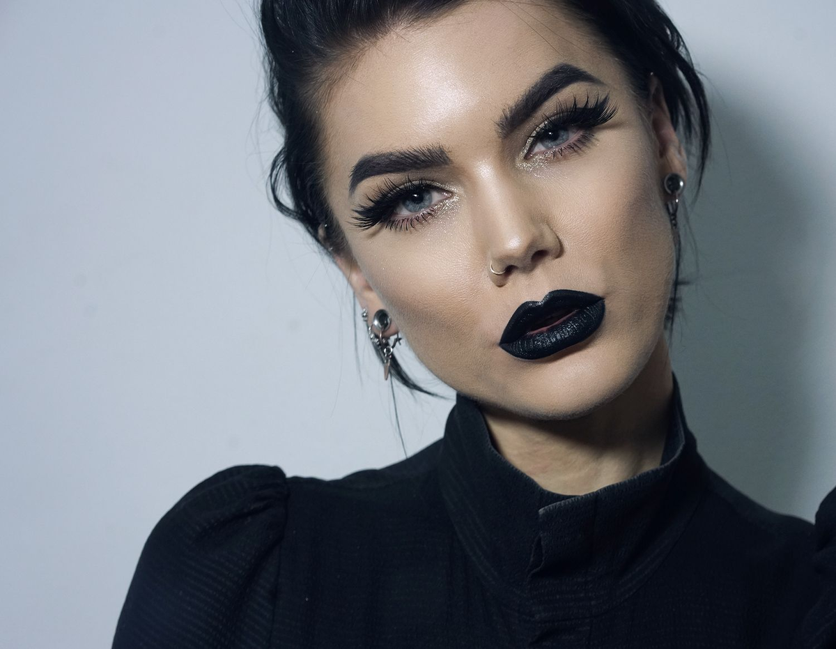 - Глянец как вариант. Черная глянцевая помада смотрится потрясающе и создает более мягкий эффект. Это отличный выбор для тех, кто хочет показать глубину цвета без излишней строгости.