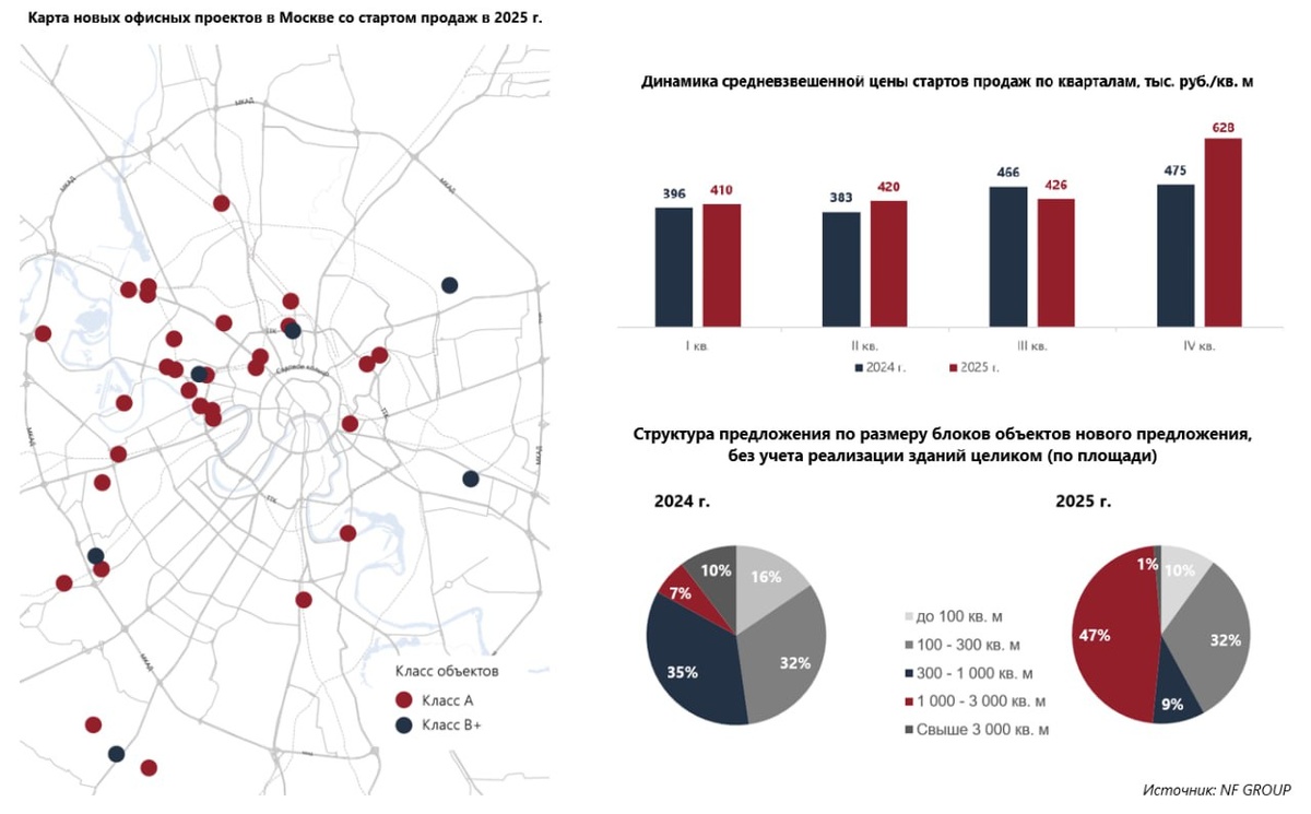 🏢 NF Group подводит офисные итоги года! И главный итог - количество стартов новых офисных проектов (привет программе МПТ). 🏢 Рекорд: в Москве в 2025 году запустились продажи сразу в 37 новых офисных проектах общей площадью около 1,2 млн м2. Это почти вдвое больше, чем в 2024 году (тогда было всего 20 проектов). При этом 84% новых объектов - офисы класса А, остальные 16% - класс B+. 📊 Из 1,2 млн м2 проектной площади больше 70% будут введены в эксплуатацию не раньше чем через три года. Наибольший объем - 45% или 551 тыс. м2 - планируется к вводу в 2028 году. То есть инвесторы покупают площади в проектах, которые еще даже не начали строить. 💰 Средневзвешенная цена на момент выхода лотов составила 447 тыс.₽/м2, что всего на 3% выше уровня 2024 года. К декабрю цена выросла до 458 тыс.₽/м2, превысив показатель декабря 2024 года лишь на 2%. 🏗 73% новых проектов расположены между ТТК и МКАД, 8% - за пределами МКАД. Только 19% новых проектов находятся внутри ТТК. Лишь 16% новых офисов