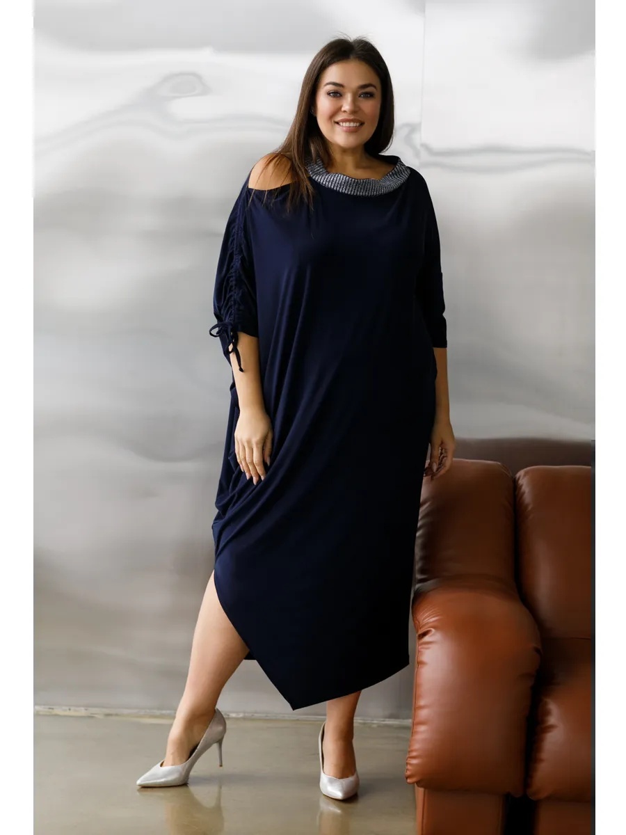 Первая модель сразу привлекает внимание асимметрией и сложным, но очень стильным кроем. Сочетание спущенного плеча с одного бока и летучей мыши с другого создаёт динамичный, современный силуэт, который отвлекает внимание от проблемных зон и фокусирует его на интересном дизайне. Трикотаж «масло» — отличный выбор для длительных мероприятий: он пластичный, приятный к телу и не сковывает движений.
