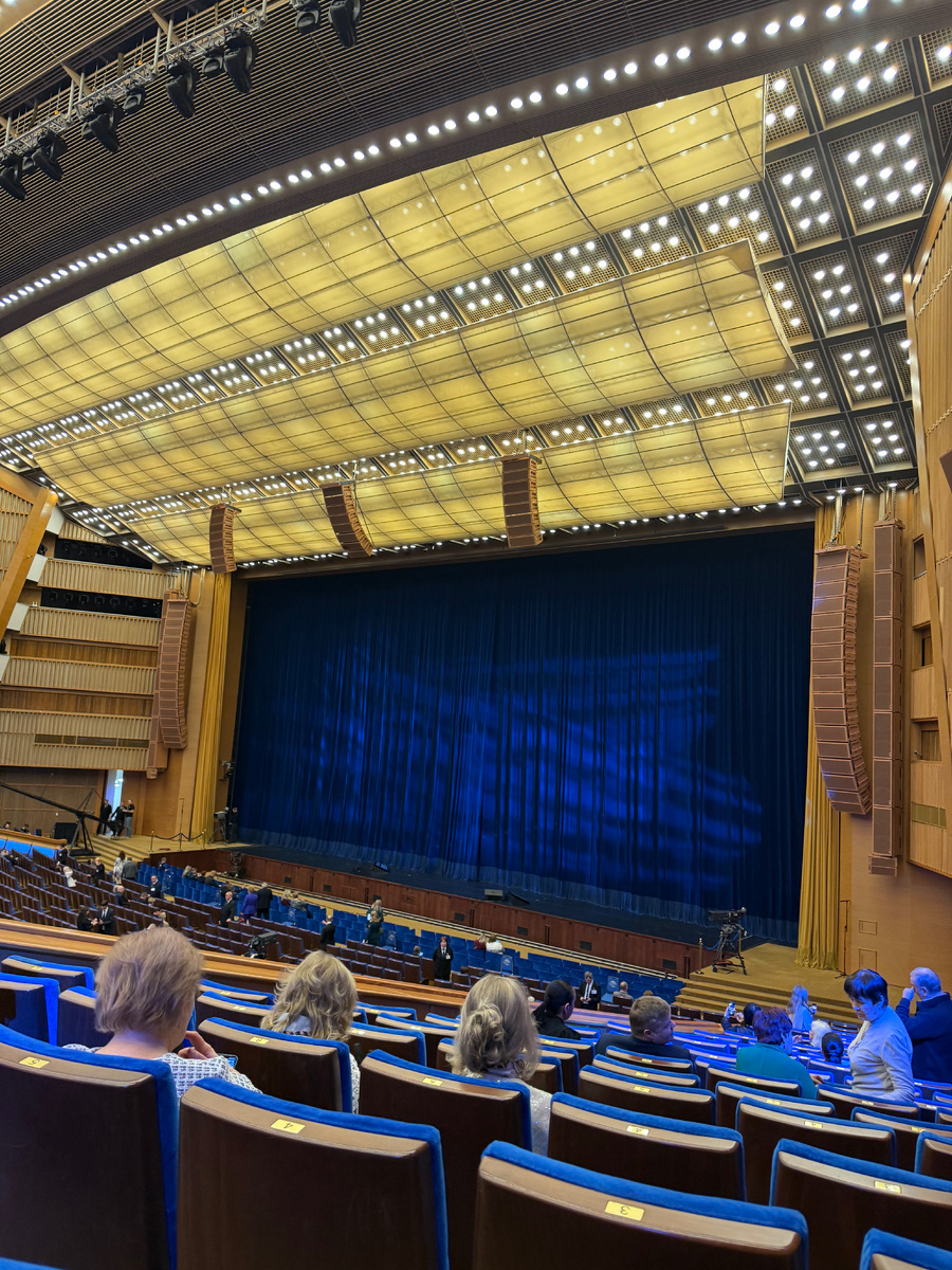 В понедельник, 8 декабря, в Кремлевском дворце прошел концерт «Наш Новый год», который я с удовольствием посетила. Очень строгие правила досмотра гостей Кремлевского дворца, безусловно, оправданы, но на само мероприятие нужно приходить как минимум за час и обязательно взять с собой паспорт! Досмотр проходит четко вежливо, ребята, проводящие его, настоящие профи и красавцы! Нарядный холл с гербами советских республик, пафосный концертный зал - все настраивает на празднично-торжественный лад! Публика, похоже, тоже собралась из разных городов нашей Родины: только стоя в очереди на досмотр, я услышала, что люди приехали и из Казани, и из Твери, и из Волгограда! Это здорово! Буфет, ожидаемо, небюджетный,и, как оказалось, многие гости к этому были готовы: на столах стояли контейнеры с нарезкой и бутербродами, люди беседовали, снимали сториз и ожидали начало мероприятия. Концерт начался! Его вели комедиант Вадим Галыгин, представившийся нам, как Фастум-гель для разогрева, Александра Реб