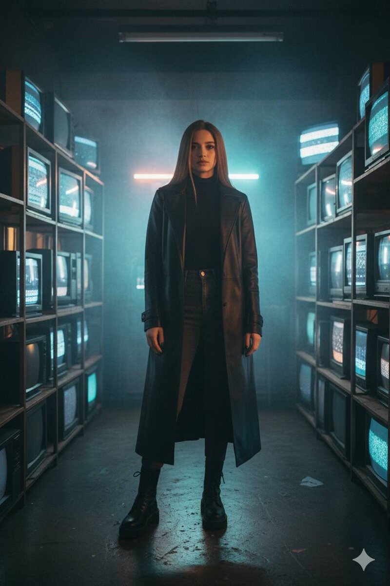 Fashion-съёмка с атмосферой фильма — всего один ПРОМТ. Нано Банана — мощная, но у неё есть слабое место: она редко создаёт настоящий киношный кадр. Этот промт ломает шаблон — добавляет свет, дым и фактуру, превращая модель в героиню нуара. Промт: A wider cinematic shot of a confident woman standing in a dim vintage room filled with flickering CRT TVs. She wears a long black leather trench coat over a fitted turtleneck and high-waisted trousers, heavy boots glinting in the shifting light. Cold blue and amber glow from the screens moves softly across her face and coat. Smoke drifts lazily through the air. Her gaze is calm but untouchable — a modern noir heroine. The scene feels cinematic and moody, captured on ARRI Alexa Mini LF, 35mm lens, tone: Americana Night Fog — retro Americana palette with warm red and teal neon contrast, halation bloom, soft haze diffusion, low-contrast shadows, subtle film grain, Kodak Vision3 500T emulation, realistic fog texture, wet asphalt reflections. Как