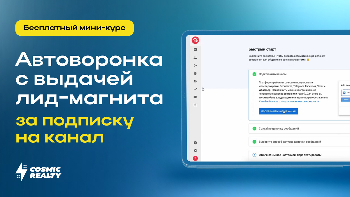 • Интегрировать чат-бота с CRM Без навыков программирования и без каких-либо специальных технических навыков. Подойдёт: предпринимателям и маркетологам. Оригинал статьи опубликован в блоге Cosmic Realty. Обращайтесь к нам, если у вас есть интерес к: - Получению лидов - Комплексному ведению маркетинга - Разработке вебинаров под ключ - Разработке квизов, лендингов, сайтов и презентаций - Настройке контекстной и таргетированной рекламы - Работе с посевами в Телеграме и