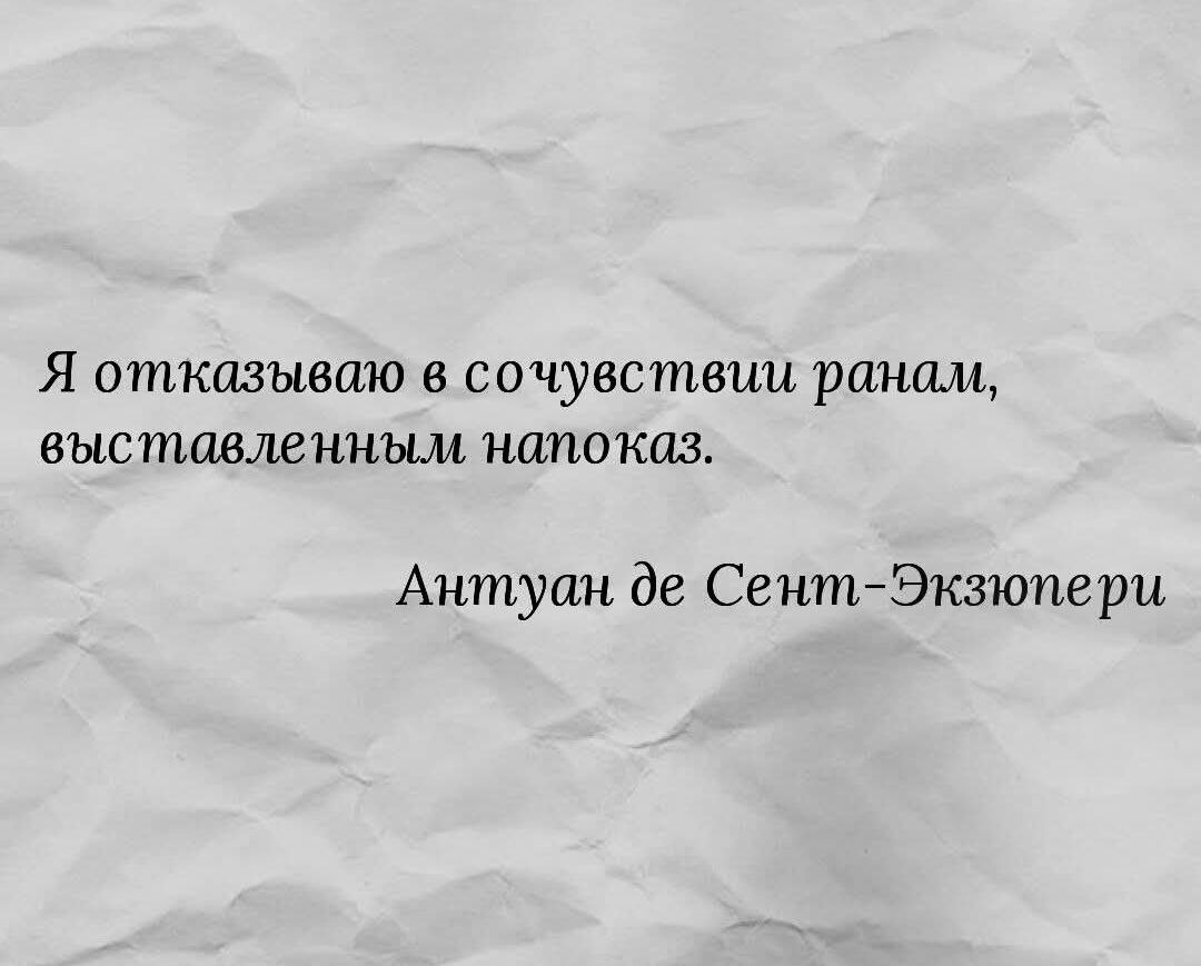 #ЭтоНепсихология Прочла сегодня цитату Экзюпери: «Я отказываю в сочувствии ранам, выставленным напоказ». И знаете, меня будто кто-то щёлкнул по лбу. Такой: — А ты сама-то? И я зависла. Потому что после смерти мужа я пишу сюда много. Иногда слишком много. Про серые дни, про темно-серые, про те, что вообще без оттенков — сплошная графитовая заливка. И вот я сижу, читаю Экзюпери, и внутри поднимается что-то очень знакомое: «Юля, а не переборщила ли ты? Не похоже ли это со стороны на демонстрацию раны под прожектором?» Я ловлю себя на том, что мне неловко. Неловко так, будто ты стоишь у окна в белье, а сосед напротив внезапно решил полить цветы. И ты такая: «Ой… это… случайность! Оно само снялось!» Но вот что я в этой неловкости поняла. Есть люди, которые "продают" свои раны. Хайпуют на трагедиях, вытаскивают их как витринное мясо, делают из боли товар. Я таких раньше и правда осуждала — до легкой изжоги. Но то, что делаю я — другое. Это не “выставить н