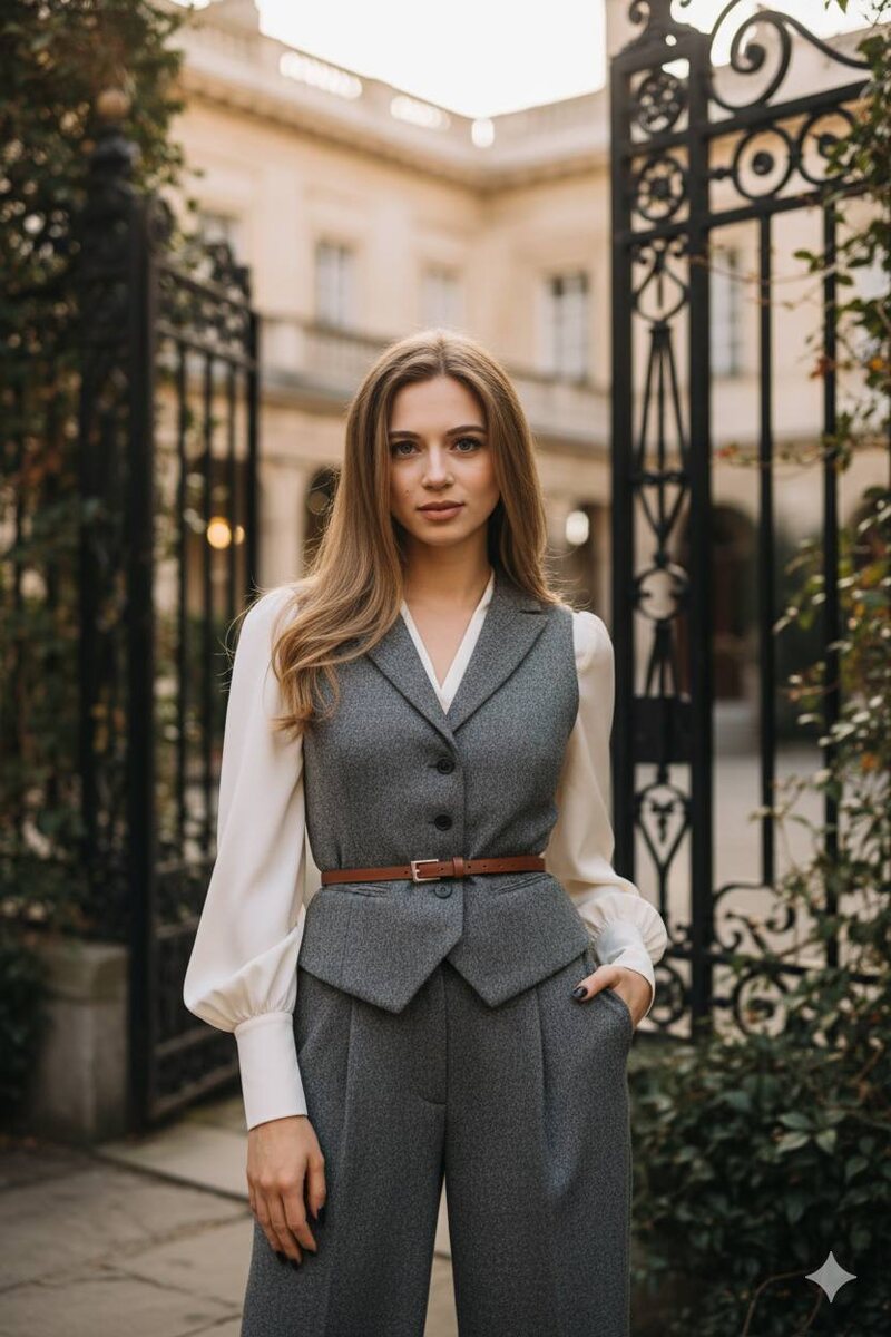 Use subject’s real face from uploaded selfie. Wardrobe: tailored grey tweed vest, wide trousers, ivory puff-sleeve blouse. Setting: historic estate courtyard, golden-hour lighting, 85 mm portrait lens. Mood: refined, timeless elegance. В стиле 90-х: