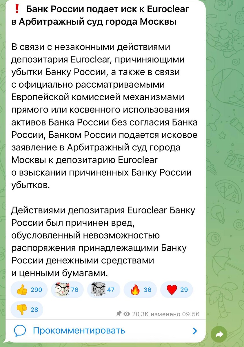 ⚡️ Банк России подает иск к Euroclear в Арбитражный суд города Москвы, сообщили в ЦБ.