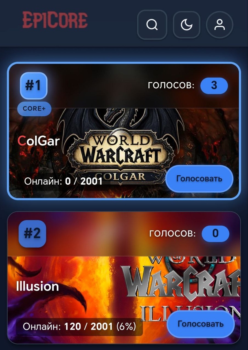 На просторах Ru-сегмента появился новый сайт-голосовалка. Его отличительная особенность - нет функции покупки голосов владельцами проектов(возможно она и появится в будущем, но надеюсь что нет). Держатели молодых проектов, бегите занимать верхние строчки хит парада!! На данный момент проголосовать можно за ColGar WoW и Illusion WoW. https://epicore.su/