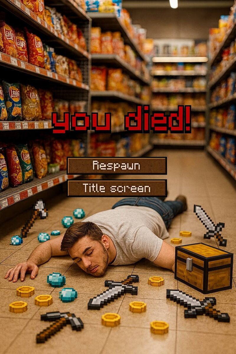 Промт дня — кадр из Minecraft в реальной жизни. Как выглядит выгорание? Молодёжь говорит — «умер». Нейросеть покажет, как это выглядит на самом деле. Нашёл и доработал промт, который превращает чувство выгорания в сцену из Minecraft. 1. Промт для ChatGPT: Transform this image [Upload Your Image] into a 64K DSLR shot resolution full-body portrait of A young man (same face as the uploaded image) is lying face down on the floor of a grocery store aisle, appearing to be “dead” in a gaming-themed scene. Superimposed on the image are pixelated video game elements such as a pickaxe, swords, treasure chest, diamonds, and coins scattered around him, creating a pixel-art style effect. The background features shelves stocked with snack foods and other grocery items, with a visible grocery store aisle extending into the distance. The scene also includes a game over message “you died!” and options for “Respawn” and “Title screen” in a pixelated font, mimicking a classic video game interface. Octan