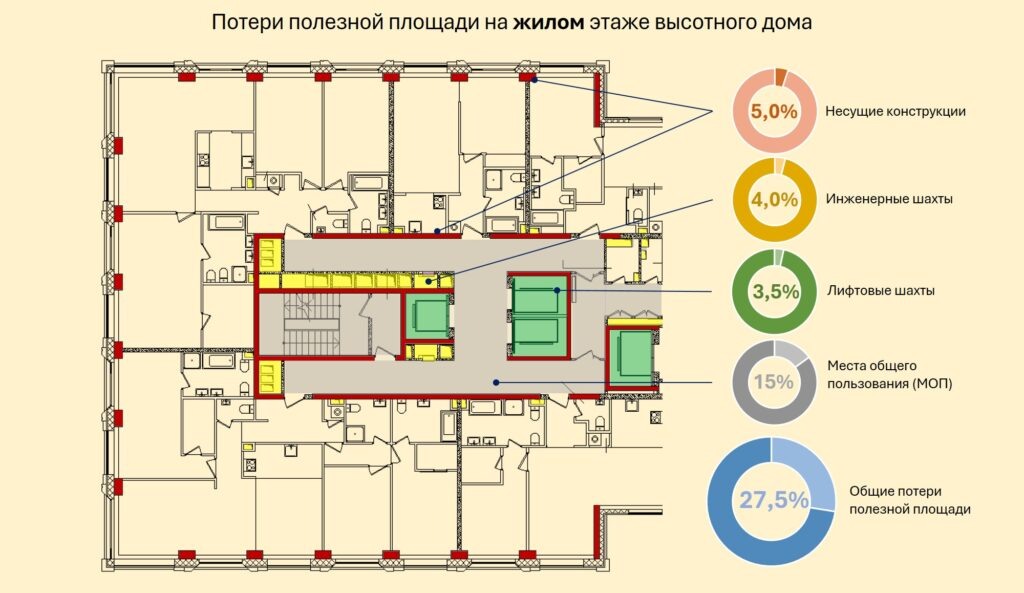 Что ж, давайте посчитаем – не зря же мы из инженерной компании. Потери полезной площади В стоимость каждого квадратного метра квартиры заложены расходы на строительство и всех других помещений и пространств жилого комплекса, в которых житель никогда не окажется.