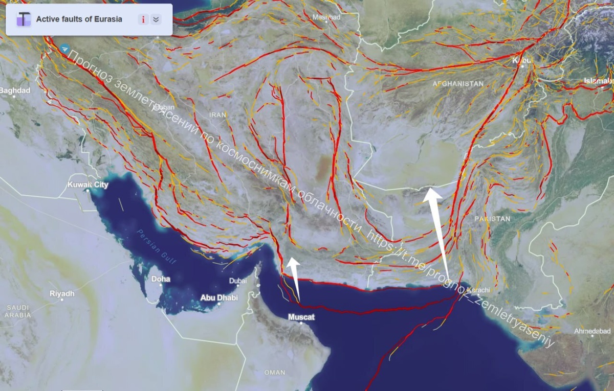 Угол на стыке Аравийской питы с Евразийской сегодня рисует ОСТИ уровня М7+. Может вызвать как сейсмические проблемы по месту, так и перетечь в сторону Гиндукуша и далее на север в сторону Памира/Тянь-Шаня...