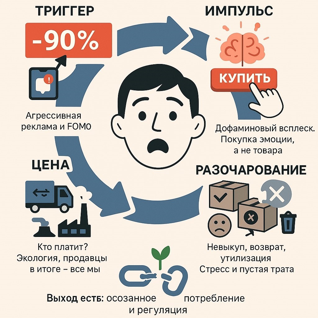 Покупатель, по сути, оплачивает и потребляет не товар, а мимолетную эмоцию обладания «выгодой». И это делает его главным финансистом всей этой нерациональной системы. Каждый раз, нажимая «заказать» под влиянием этого импульса, мы голосуем рублём за то, чтобы мир потребления становился всё более иррациональным и расточительным.