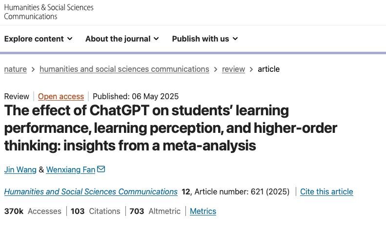 Сегодня хочу поделиться результатами важного метаанализа 2025 года, который проливает свет на то, как искусственный интеллект — в частности ChatGPT — реально влияет на обучение. Это одно из самых масштабных исследований на данный момент: анализ 51 экспериментального и квази-экспериментального исследования, отобранных из 201 работ, опубликованных в 2022–2025 гг. ❓ Главный вопрос, который ставили авторы: повышает ли ChatGPT качество обучения — или наоборот мешает? На основании 72 независимых эффектов ответ получился однозначный: ✔️крупный положительный эффект на учебные результаты — g = 0.867; ✔️умеренный рост восприятия и вовлечённости — g = 0.456; ✔️умеренный рост навыков более высокого уровня мышления — g = 0.457. 🔍 Что именно усиливает ИИ в обучении? Исследование выделяет несколько условий, при которых эффект ChatGPT максимален: 1️⃣ Чёткие дидактические рамки Когда работа с ИИ встроена в образовательную модель (например, уровни Блума), рост сложного мышления становится значит