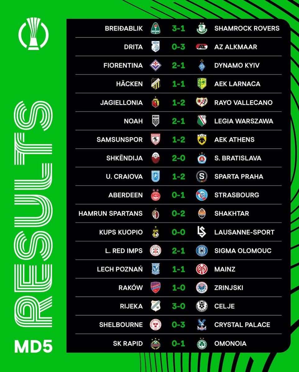 Греческий «АЕК» наносит лидеру таблицы «Самсунспору» первое поражение на общем этапе и залетает в топ-8. «Страсбур» удержал минимальное преимущество до финального свистка и первый раз играет на ноль в ЛК. «Кристал Пэлас» уничтожает ирландский «Шелбурн» уже в первом тайме подбиваясь к зоне прямого выхода в плей-офф.