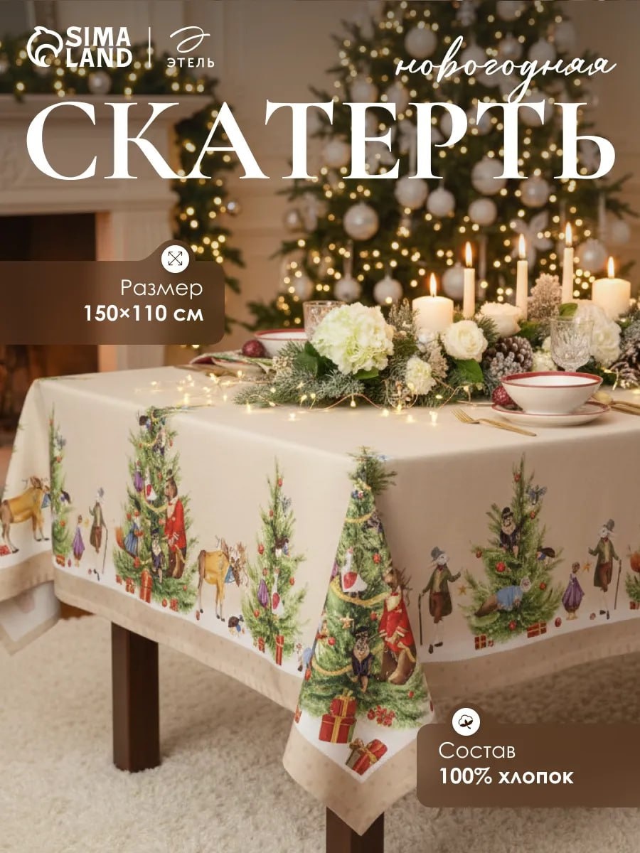 Скатерть новогодняя на стол 150 х 110 см, прямоугольная. Скатерть Этель "Noble Christmas" скатерть 150х110 +/-2см с ГМВО, 100% хлопок, саржа 190гр/м2. Тканевая скатерть для сервировки станет важным элементом декора, создающим уют и праздничную атмосферу в доме. Этот аксессуар помогает обновить интерьер к Новому 2026 году, внося эстетичные акценты и подчеркивая заботу о деталях. Цена: 772 руб. Ссылка: https://www.wildberries.ru/catalog/501860275/detail.aspx?targetUrl=SN