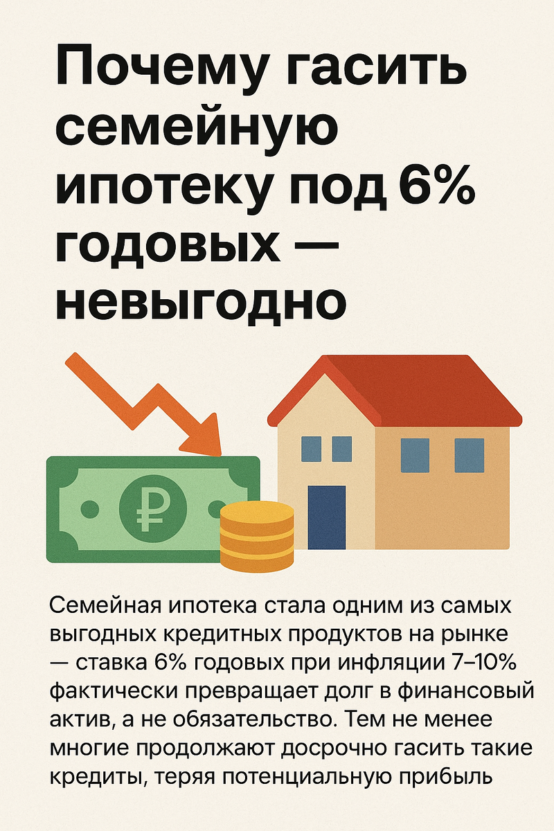 Россия, 2025 Семейная ипотека стала одним из самых выгодных кредитных продуктов на рынке — ставка 6% годовых при инфляции 7–10% фактически превращает долг в финансовый актив, а не обязательство. Тем не менее многие продолжают досрочно гасить такие кредиты, теряя потенциальную прибыль. Разберём, почему досрочное погашение ипотек под 6% — чаще всего ошибка, и какие инструменты могут приносить доход выше ставки по ипотеке. 🔥 1. Инфляция “съедает” ипотеку быстрее, чем растут проценты Если инфляция в стране стабильно выше ставки по ипотеке (7–10% против 6%), то фактически происходит следующее: вы занимаете деньги “дорогие” сегодня,а отдаёте “дешёвые” в будущем Пример: 25 000 ₽ платежа сегодня через 25–30 лет будут стоить как 1–2 тысячи ₽ в сегодняшних деньгах. То есть долг сам по себе дешевеет со временем. 🔥 2. Эффективная ставка по ипотеке ниже реальной доходности большинства инструментов Если сравнить: доcрочное погашение экономит 6% годовых вклад может давать 8–12% облиг