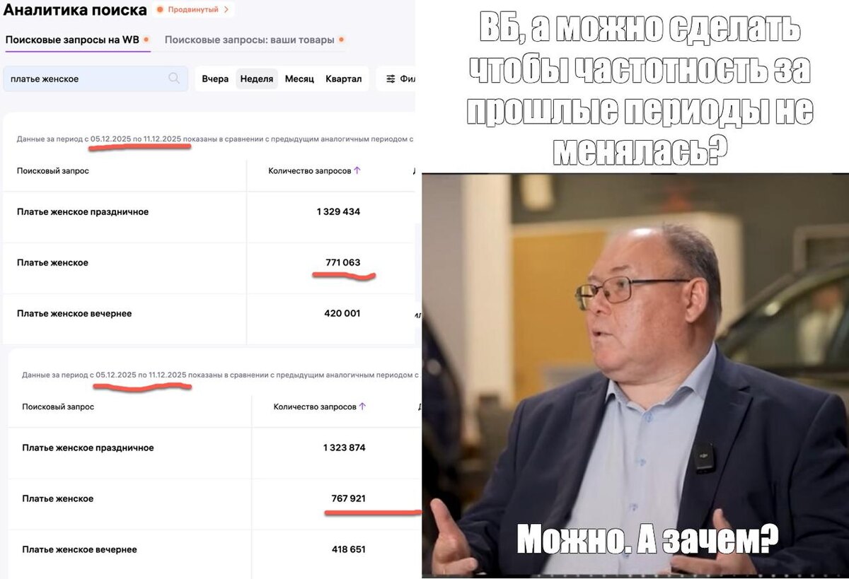 С прошлой недели заметил что-то странное происходит с частотностью - в течении дня частотность изменяется за уже прошедшие периоды. Спросил у поддержки в чем дело, сначала запросили видео или скриншоты, отправил, так они запросили полноэкранные, чтобы время было видно, хотя на скринах и так все понятно, что данные меняются. Для себя решил больше не общаться с вб через поддержку, боюсь не выдержу и нахамлю им. Толи они там что-то сломали, толи статистику пытаются накручивать. Меня в этой связи больше интересует вопрос: А рекламные показы за прошлые периоды тоже вместе с частотностью увеличиваются за прошедшие дни? Еще заметил аномальный рост частотности запросов ничем не обоснованный, но в этом стоит разбираться и искать логику если цифры скакать не будут
