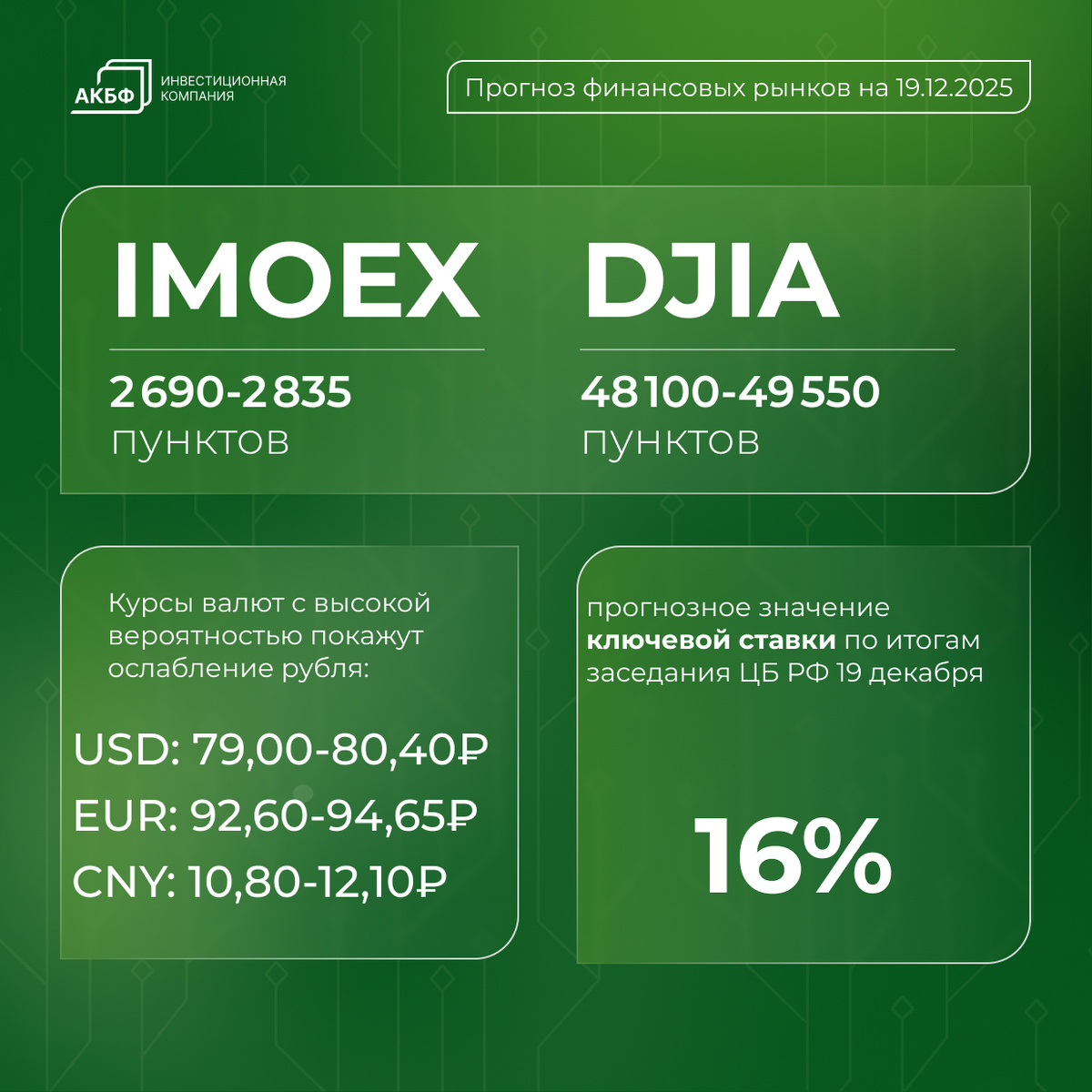 На пятницу, 19 декабря 2025 года Российский и американский рынки акций Фондовые индексы России и США, по нашим оценкам, сохранят потенциал роста. На валютном рынке при высоких рисках прогноза — из-за приближения USD/RUB и EUR/RUB к среднесрочным справедливым уровням, усиления волатильности и влияния нерыночных факторов — преобладают шансы укрепления рубля к доллару и евро, тогда как к китайскому юаню вероятно ослабление. Прогнозные целевые диапазоны закрытия следующей пятницы: • Индекс Мосбиржи: 2690–2835 пунктов • DJIA: 48 100–49 550 пунктов • USD/RUB: 79,00–80,40 • EUR/RUB: 92,60–94,65 • CNY/RUB: 10,80–12,10 Прогноз мировых цен на нефть и золото Преобладают шансы роста индикативных цен на нефть и золото. Базовый сценарий на середину января: • Золото: $4150–$4550 за унцию • Нефть: $60–$80 за баррель Облигации федерального займа (ОФЗ) В краткосрочной перспективе по широкому сегменту ОФЗ преобладают шансы на снижение доходностей. По выпуску 26226 на конец следующей недели целевой усред