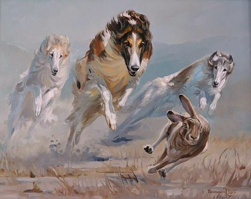 Волк, это 50 килограмм злобы и мышц. Борзая, это 35-40 килграмм элегантности. Как она побеждает? Нет не в лоб зубами, а тактикой. Борзые, это зрячие охотники, которые способны увидеть добычу издали, за многие версты, готовые устремиться в погоню на бешеной скорости, преследуя зверя.