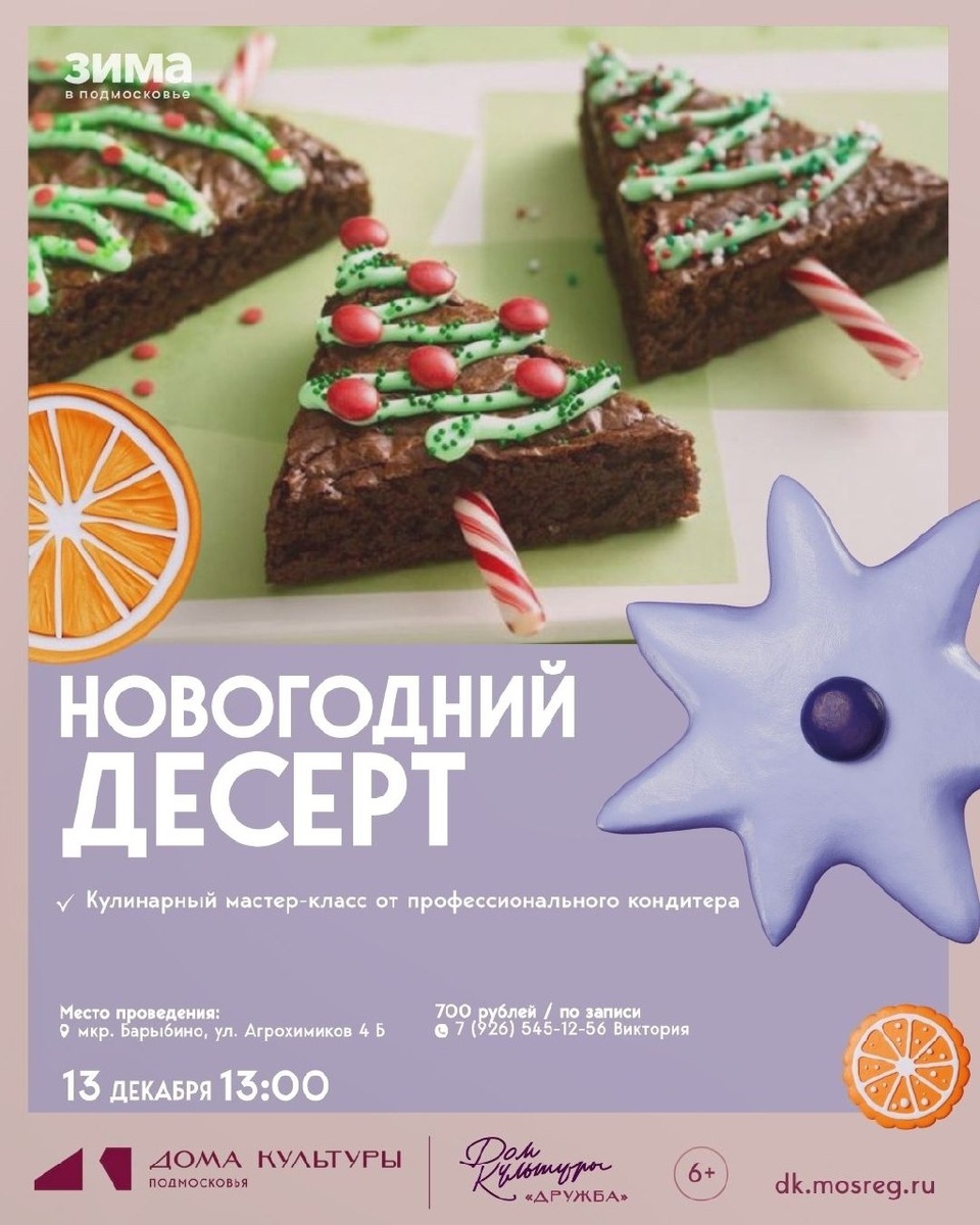 ✨ ***НОВОГОДНИЙ 🎄 ДЕСЕРТ*** ⌚️В субботу 1️⃣3️⃣декабря в 1️⃣3️⃣.0️⃣0️⃣ состоится кулинарный мастер-класс от профессионального кондитера Виктории. 🧚🏻♀️ В процессе готовки ребенок обретает навыки самоорганизации, ведь чтобы что-то приготовить, нужно следовать определенной последовательности. 🧚🏻♀️ Кулинарные эксперименты помогут развить творческие способности. ГЛАВНОЕ - будет очень ВКУСНО 😋 по записи ☎️ +7 (926) 545-12-56 Виктория 🚫 Возраст: 6+ 📆 13.12.2025🕒13:00 🏢 Городской дом культуры «Дружба» 📍 г.о. Домодедово, мкрн.Барыбино, улица Агрохимиков, д.4Б 💰 Цена: 700 ₽ ✅ Мероприятия Домодедово https://dzen.ru/id/66f10385cc4c5a16f7b5fb02 http://vk.com/domodedovo_events http://dzen.ru/domodedovo_events