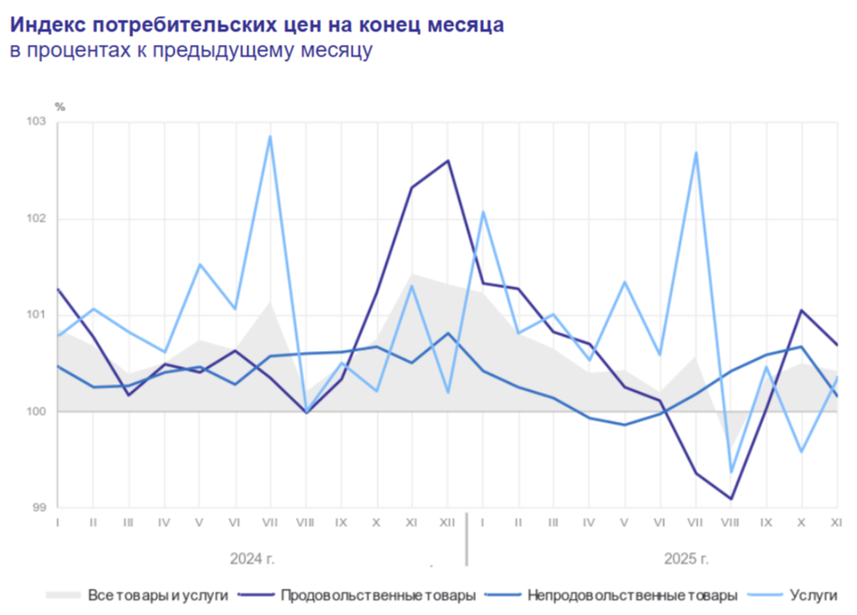 Ⓜ️ По данным Росстата, за период с 2 по 8 декабря ИПЦ составил 0,05% (прошлые недели — 0,04%, 0,14%), с начала месяца 0,06%, с начала года — 5,31% (годовая — 6,12%). Месячный пересчёт ноябрьской инфляции составил 0,42% (недельные данные показывали 0,43%) — это выводит нас на ~2% saar (месячная инфляция без сезонных факторов, умноженная на 12), то есть годовая динамика ИПЦ продолжает снижаться и это гораздо меньше, чем закладывал регулятор (4%). Темпы декабря продолжают оставаться на низких уровнях (спасибо 5 дефляционной недели цен на бензин/снижению стоимости на помидоры) и точно не повторят подвиг прошлого года (в декабре 2024 г. инфляция составила 1,32%). Отмечаем факторы, влияющие на инфляцию: 🗣 Из потребительских цен на нефтепродукты следует, что розничные цены на бензин снизились за неделю на -0,18% (прошлая неделя — -0,26%), дизтопливо подорожало на 0,14% (прошлая неделя — 0,35%), пятая дефляционная неделя в бензине удивляет (вес бензина в ИПЦ весомый ~4,35%). Правительство у