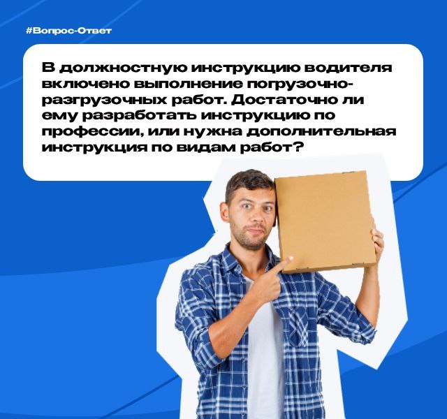 #ВопросОтвет В должностную инструкцию водителя включено выполнение погрузочно-разгрузочных работ. Достаточно ли ему разработать инструкцию по профессии, или нужна дополнительная инструкция по видам работ? Когда в должностной инструкции водителя уже прописано, что он должен выполнять погрузочно‑разгрузочные работы, это дает основание считать, что часть функций водителя расширена. Однако одной общей инструкции по профессии зачастую недостаточно — для разных видов работ (например, погрузка, разгрузка, работа с подъемным оборудованием и иные специальные операции) необходимы дополнительные инструкции по видам работ. 👉 Рекомендация эксперта. В данной ситуации рекомендуем разработать более подробные инструкции по конкретным видам, например: «инструкция по разгрузке грузов вручную», «инструкция по работе с подъемным механизмом», «инструкция по закреплению груза». Подробный разбор от наших экспертов смотрите в карточках к посту