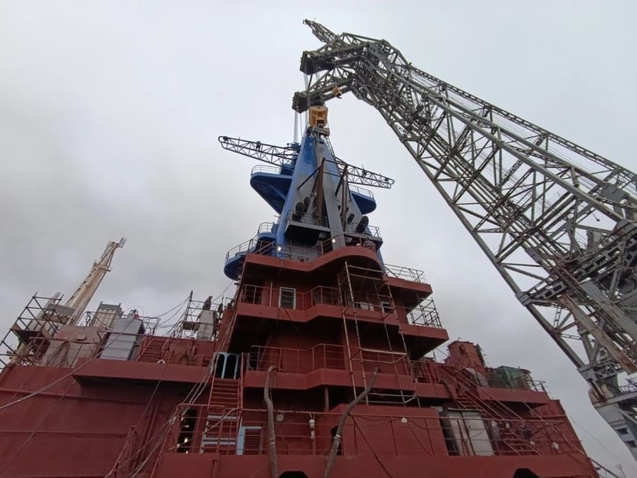 На строящемся атомном ледоколе «Чукотка» установили мачту высотой 18,6 м и весом 76 тонн