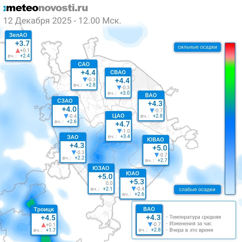 В 12:00 в Москве было от +2.9°C до +5.9°C, средняя температура +4.5°C #погода #Москва #зима #температура #12декабря #пятница