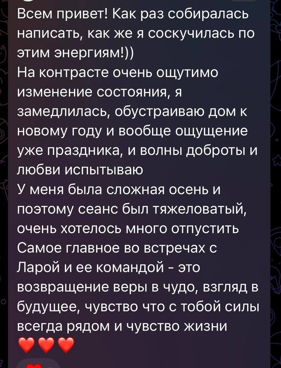 💔Потерянное Новогоднее настроение, потерян контакт с Будущим, состояние «мне небезопасно», бессилие и усталость! То, что я вижу сейчас у бОльшего количества людей. 🎆Сколько бы огней не зажигали вокруг - внутри «не горит»! Это общий фон Поля вокруг, это щупальца системы, которые пронзают мозг и сердце, и ты теряешь волю к борьбе за свою свободу и свои мечты. ➕Я не могу и изменить Мир, и те события, которые сейчас происходят в конце года, когда за энергией человека идет охота! ВСЕ ПРОГРАММНЫЕ ХВОСТЫ из Рода и долги Кармы обострились на максималках, и испытывают каждого на прочность Духа и Веру в свой Путь. 🎄Я лишь могу создавать пространства, в которых вам будет легче со всем этим справиться, опираясь на свой СВЕТ внутри и Высшие Силы, которые всегда РЯДОМ! Даже не сомневайтесь! 🌙В субботу в 09.30 по мск я проведу новый ИСЦЕЛЯЮЩИЙ СЕАНС в каналах Великих Архангелов и Космических энергиях, где мы сделаем акцент на глубокое очищение всех систем и разрушение негативных сценариев