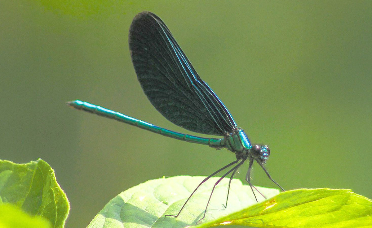 Известна также как красотка темнокрылая, научным языком Calopteryx virgo. У этой стрекозы из семейства красоток крылышки дымчатые, а тело с металлическим отливом: у самцов – синим либо темно-фиолетовым, у самок – бронзово-зеленым. И представить сложно, что вот такое хрупкое создание – хищник как во взрослой стадии, так и в личиночной: водные личинки охотятся на мелких беспозвоночных и икру рыб, взрослые особи ловят в полете других насекомых – питаются комарами, мошками, бабочками, мухами и даже другими стрекозами. Обитает она возле проточных водоемов – рек, ручьев и служит своеобразным индикатором чистоты воды, поскольку очень чувствительна к загрязнению и старается быстрее покинуть неподходящее место. Между прочим, охраняемый вид. Внесена в Красную книгу Москвы под 2-й категорией – редкие или малочисленные виды.