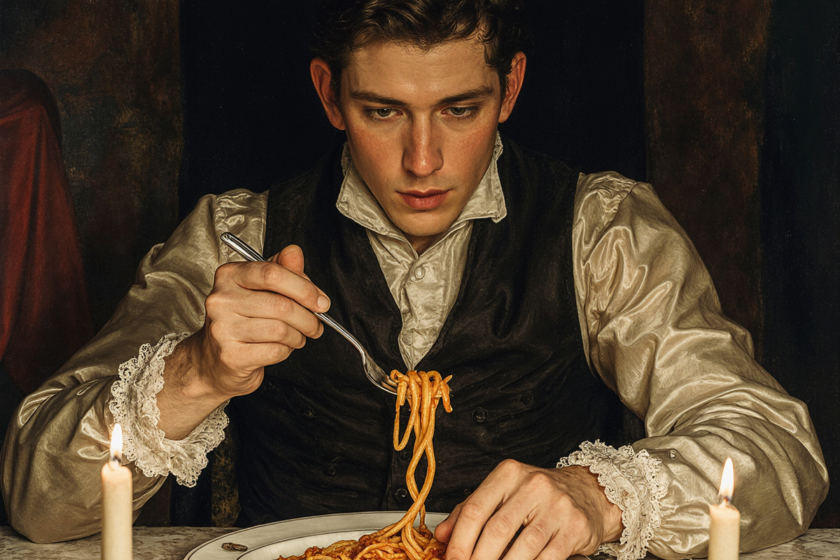 Джованни уронил вилку. Томатный соус брызнул на белые кружевные манжеты. Испанский вице-король смотрел через стол. Молча. Это был 1732 год. Неаполь находился под испанским правлением. Приглашение на ужин к вице-королю означало влияние, связи, доступ к решениям. Отказаться нельзя. Опозориться — тоже. А на столе стояли спагетти. В те годы длинная паста только начинала проникать из уличных лотков на столы знати. Беднота ела её руками — запрокидывала голову, запускала макароны в рот прямо на площадях. Быстро, дёшево, сытно. Никакого этикета. Но аристократы не могли позволить себе есть руками. Камзолы из шёлка, кружевные воротники, напудренные парики. Одно неловкое движение — и соус размазан по лицу. При дворе такое запомнят надолго. Джованни пытался справиться с вилкой. Подцеплял 2-3 нити. Поднимал. Макароны соскальзывали обратно. Он накручивал их на вилку. Получался огромный клубок, который невозможно засунуть в рот целиком. Приходилось откусывать. Концы свисали. Соус капал на тарелку, н