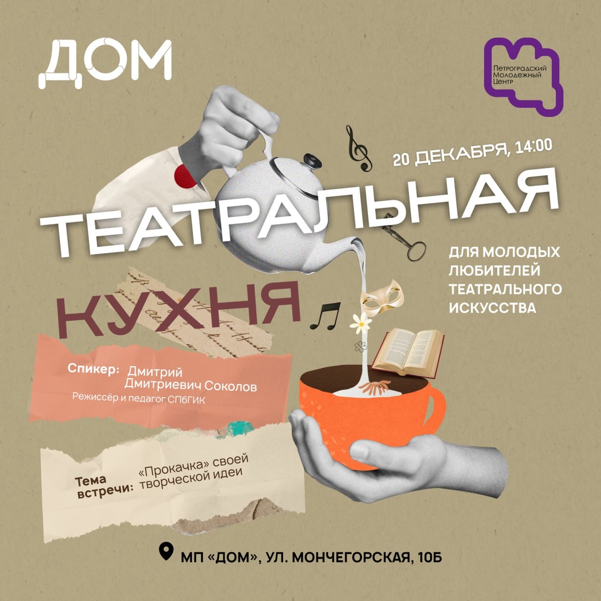 🎉Финальная встреча года! Момент, когда твоя идея в центре внимания! Большая или маленькая, едва зарождающаяся или давно ждущая своего часа. Приноси все, что так давно хотелось превратить в театр: фрагменты, впечатления, образы, смелые мысли. Здесь нет ограничений, есть только свободное пространство для творчества! Встречу проведет Дмитрий Дмитриевич Соколов (СПбГИК) — режиссер и педагог, который поможет увидеть твою задумку с нового ракурса, подсветить сильные стороны и ответить на вопросы, которые давно крутятся в голове. 💡 Что тебя ждет: – Живой творческий диалог; – Разбор, как начинать и развивать театральную задумку; – Советы, как перестать бояться «первого шага»; – Уютная атмосфера, поддержка и вдохновение! 🗓 20 декабря | 14:00 Забирай свой билет! Чайник уже вскипел, стол накрыт и мы готовы обсуждать, фантазировать и воплощать идеи вместе❤️