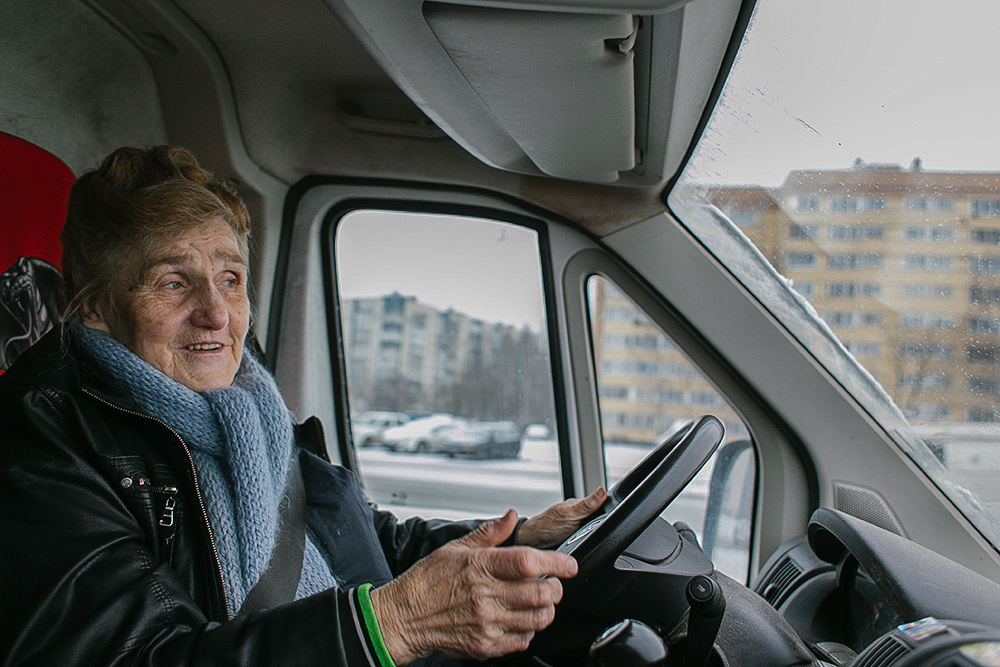 Блокадница едет по заснеженным обледенелым дорогам аккуратно и сосредоточено, но при этом уверенно: она за рулем уже больше 50 лет. После работы на заводе пенсионерка поняла, что без машины не может, и выйдя на пенсию устроилась водителем в фонд «Вера. Надежда. Любовь».
