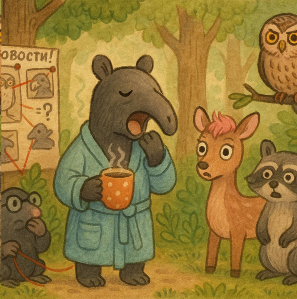 Однажды утром, когда солнце уже во всю освещало мох, а Енот бодро доламывал заварной пирог, Тапир, потягиваясь и выходя из своего домика, зевнул и сказал: — Я, между прочим, сова. И ушёл обратно в дом. Просто вот так. Без пояснений. ________________________________________ Первой встрепенулась Косуля Сосуля: — В смысле? Он же Тапир. Чепрачный. А не пернатый. Кротон задумчиво почёсывал ухо и шептал: — Он вроде чай пил. Без мухоморов. Вроде… Енот, которому только что запретили залезать в чайник, сказал: — А может… он просто мутировал? Началась лесная суматоха. ________________________________________ Кто-то подошёл к Сове и шепнул: — Слушай… Ты уверена, что ты — ты? — Да, — сказала Сова, медленно мигая. — Потому что Тапир говорит, что он сова. — Но я сова. — Так может, он теперь ты? А ты — он? Сова покачала головой. — Я слишком уставшая, чтобы быть кем-то ещё. ________________________________________ Косуля написала петицию "Остановим путаницу: тапир ≠ сова". Кротон пытался составить схе