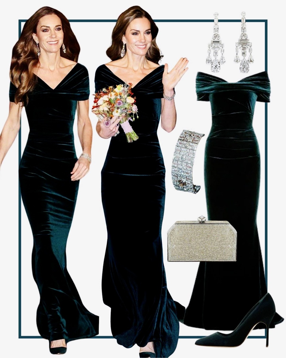 Royal Variety Performance в Лондоне всегда работает как подиум, где королевская семья показывает, на что способна классическая элегантность. ______________________________________ Больше интересного в моем телеграм канале Гламурная bestия https://t.me/glamorousbestia И по ссылке в шапке профиля 🫶 ______________________________________ И в этот вечер Кэтрин снова доказала, что она не просто наследница королевского стиля, а автор своего собственного визуального языка. Ее образ в изумрудных тонах получился глубоким, зрелым, мягким и сильным одновременно. Платье Talbot Runhof Вечернее бархатное платье Bobonne стало главным акцентом выхода. Изумруд лег на ткань плотно, почти густо, и за счет бархата заиграл мягким объемом при каждом шаге. Фасон подчеркивает осанку Кэтрин: приталенная линия, четкий силуэт, спокойная драма открытых плеч. Интересно, как она слегка подняла линию декольте, сделав образ строже, сдержаннее, ближе к классике. В этом решении слышится фирменная корректность