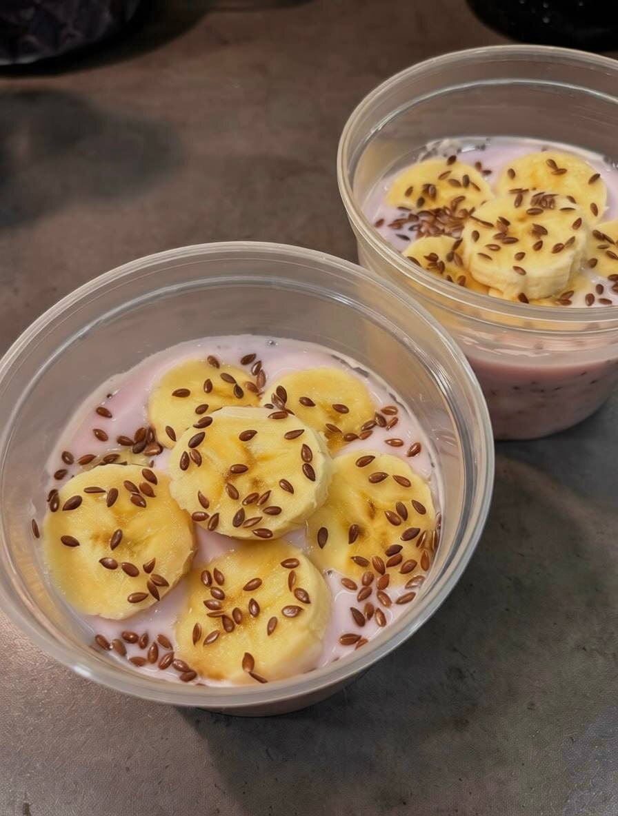 Поэтому решила так же продублировать рецепт тут для своих читательниц. Для приготовления вам понадобится: овсяные хлопья - 50 гр. Берите с временем варки от 10 минут. йогурт - 50 гр. Можно использовать натуральный питьевой йогурт без вкусовых добавок, если хотите еще больше снизить калорийность. мягкий творог - 60 гр. Я взяла попробовать обезжиренный, мне понравился этот вариант. семена чиа - 1 столовая ложка; любые фрукты, орехи или семена для украшения - у меня это половина банана и семена льна. Так же можно использовать яблоки, клубнику, хурму, все что придумаете. Можно добавлять орехи для вкуса. Приготовление: Занимает всего 5 минут. Берем контейнер или красивую баночку с крышкой