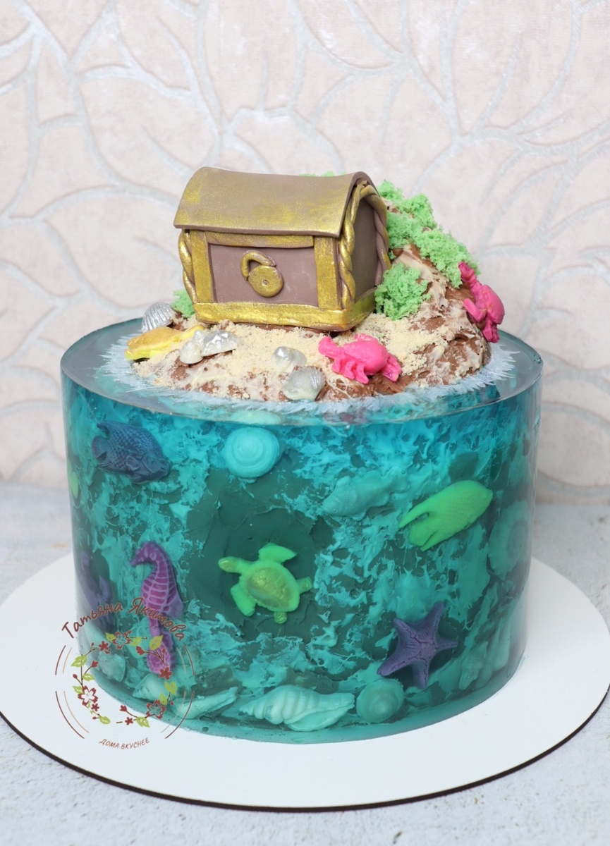 Прикрепить на торт шоколадный декор (рыбки, ракушки, мох, сундук) на ганаш или шоколад.