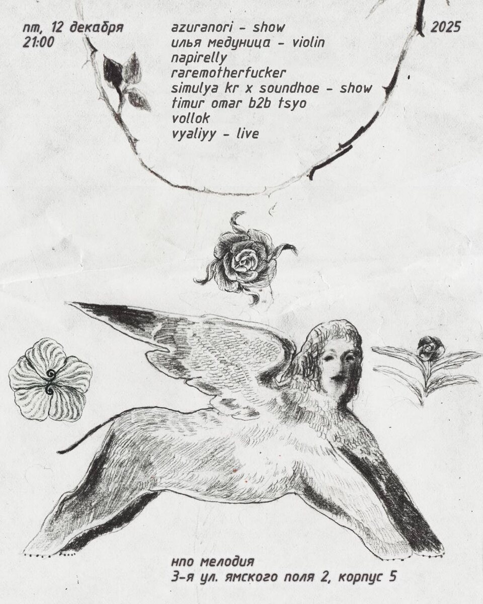 Ближайший уикенд в НПО Мелодия, 12.12–14.12 📆 Пятница, 12 декабря 🎫 билеты на входе Концерты и лайвы от Simulya Kr & Soundhoe, Vyaliyy, Azuranori, Ильи Медуницы. Диджеи: вау-эффект Timur Omar b2b Tsyo, впервые в клубе Napirelly, а также raremotherfucker и петербуржец Vollok. 📆 Суббота, 13 декабря — sick & pinwheel билеты по ссылке Плавненько начнёт Artem Orlov. С полуночи — Current Call, A/DV и Les. Утренний, как минимум 3-часовой сет, от кураторок мероприятия — Nastya Tkacheva и Utah. 📆 Воскресенье, 14 декабря — WIP x RROOM 🎫 билеты по ссылке Коллаборация команд WIP и RROOM. В гостях — привоз из Румынии Gescu. Интро от Pavel Gro, подхватывает J.P., а с полуночи Karl Chix. В прайм Denis Korablev. Утренний Gevorg Simonyan — до последнего трека. 📍 нпо Мелодия, Москва, 3-я ул. Ямского Поля, 2, корп. 5