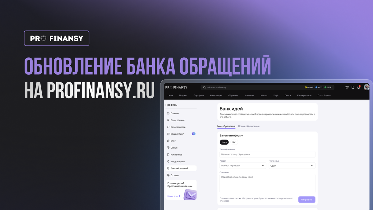 Вышло обновление раздела «Банк обращений» на сайте profinansy.ru. Что изменилось? ▪️ Теперь можно следить за статусом своего обращения – от «Принято» до «Внедрено». ▪️ После решения обращения вы получите уведомление на телефон или на сайте profinansy.ru. ▪️ Если у специалиста возникнут вопросы, он свяжется с вами. Иногда буду смотреть ваши предложения! А вы уже можете отправить их ♥️ → НАПИСАТЬ В БАНК ОБРАЩЕНИЙ