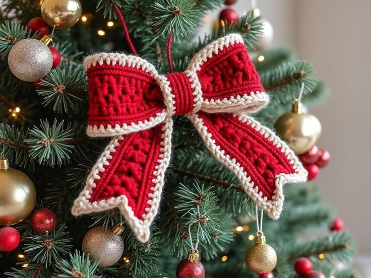 В 2026 году очень много елок с бантиками из ткани - в красном, белом цвете, большие и маленькие. Так вот как раз связать бант под силу любой рукодельнице даже начинающей. Вязать проще крючком, а из пряжи можно отдать предпочтение хлопку с акрилом, например, Gazzal Jeans.