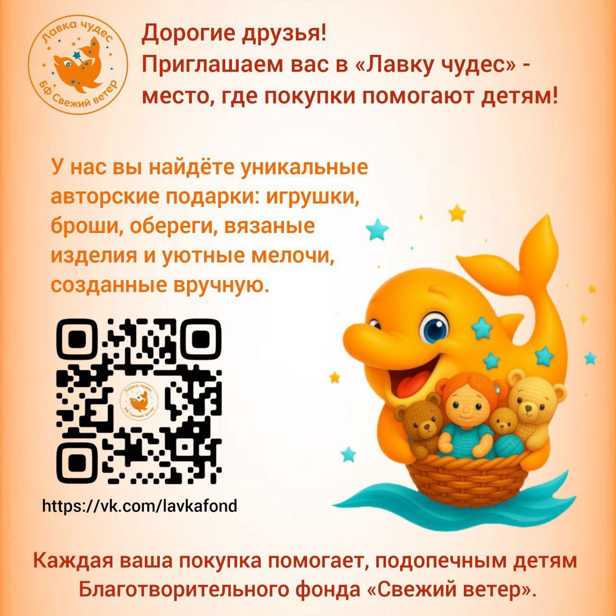 Дорогие друзья! Если вы: 🎁 Готовитесь к праздникам 🎄 Ищете подарок с душой ✨ Хотите сделать доброе дело легко и приятно Мы приглашаем вас посетить Лавку чудес https://vk.com/lavkafond У нас вы найдёте уникальные авторские подарки: игрушки, броши, обереги, вязаные изделия и уютные мелочи, созданные вручную мастерицами с теплом и любовью. Но главное - каждая ваша покупка помогает детям, подопечным Благотворительного фонда «Свежий ветер». Вы выбираете красивую вещь - а вместе с этим дарите ребёнку шанс на лечение, поддержку и надежду. Приходите, выбирайте, поддерживайте - и становитесь частью большого чуда 💛