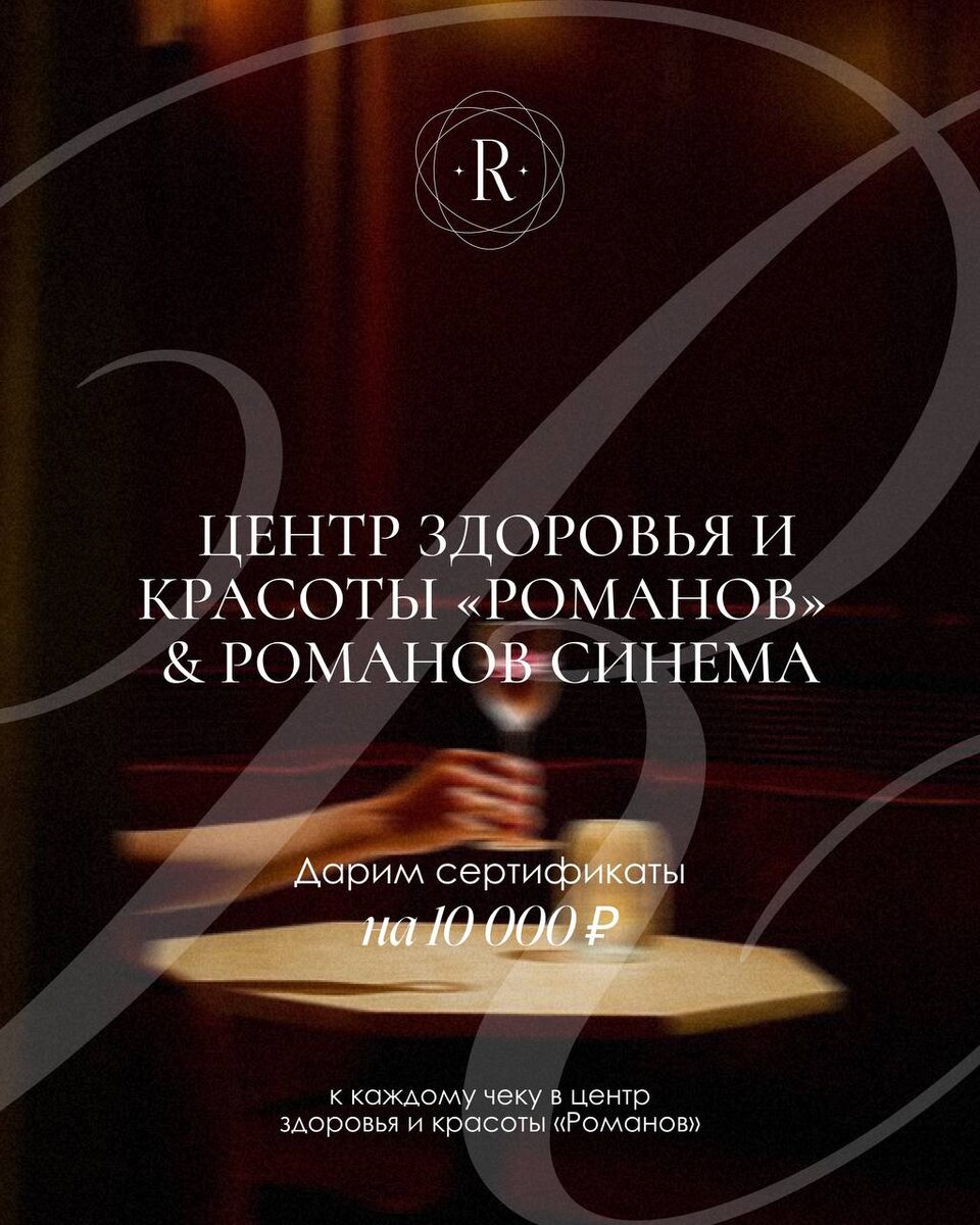 Центр здоровья и красоты «Романов» × Романов Синема Мы объединились, чтобы радовать вас ещё больше!🤍✨ К каждому чеку в Романов Синема мы дарим сертификат на 10 000₽ в Центр здоровья и красоты «Романов» Сертификатом можно оплатить до 30% от стоимости услуг. Красивый вечер — и забота о себе в продолжение! Подробности у администраторов: @romanov_beautyconcierge