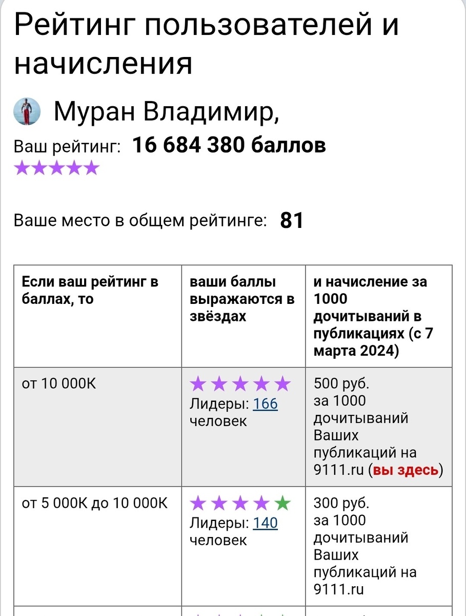 Привет Друзья! Вы наверное знаете, что размещая свои статьи и видео на сайте 9111. ru можно зарабатывать. И в отличии от других таких же платформ (Дзен, ВКонтакте, Паблико и др) вы получаете не фиксированные выплаты, а от 50 до 500 рублей за 1000 дочиток, согласно рейтинга. Мой рейтинг например более 16 млн и я получаю по 500р за 1000 дочиток. Много это или мало? Судите сами, например на Дзене платят только 12р! Раньше конечно на платформе 9111. ru был конкурс лучших публикаций в которых я часто выигрывал входя в ТОП 30 лучших авторов в среднем от 500 до 1500 рублей за публикацию! Но это в прошлом, а жаль За этот год за конкурс я получил более чем в 3 раза больше, чем просто за дочитки. А что же с моими рефералами, сколько я за них получил? Кто не знает, то реферал, это - автор, который зарегистрировался на сайте 9111. ru по моей реферальной ссылке: Мало того, что он может сразу получать гонорар за свои публикации, не проходя никаких "порогов", как на Дзене или ВК, так ему за э