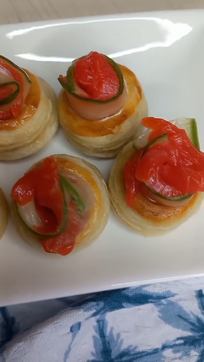 Нежные мини-волованы из слоёного теста с кремовым сыром, свежим огурцом и деликатной красной рыбой — идеальный вариант для праздничного стола. Готовятся легко, выглядят эффектно и исчезают мгновенно. Ингредиенты: Слоёное бездрожжевое тесто Сыр творожный Огурец Красная рыба Яйцо — для смазывания 1. Раскатайте тесто и вырежьте из него кружочки. Чем меньше диаметр — тем миниатюрнее и изящнее будут волованы. 2. У половины кружков вырежьте серединку — это будут верхние «колечки». 3. Нижние кружочки смажьте яйцом, сверху выложите кольцо из теста и тоже слегка смажьте. 4. Дно каждого волована наколите вилкой, чтобы оно не пузырилось. 5. Запекайте до золотистости. Если середина всё же поднялась — слегка придавите пальцем после выпечки. 6. Внутрь каждого волована положите творожный сыр. 7. Огурец нарежьте тонкими лентами, рыбу — полосками, сверните рулетики и уложите их сверху на сыр. Эти воздушные, хрустящие волованы с нежной начинкой станут звездой вашего новогоднего